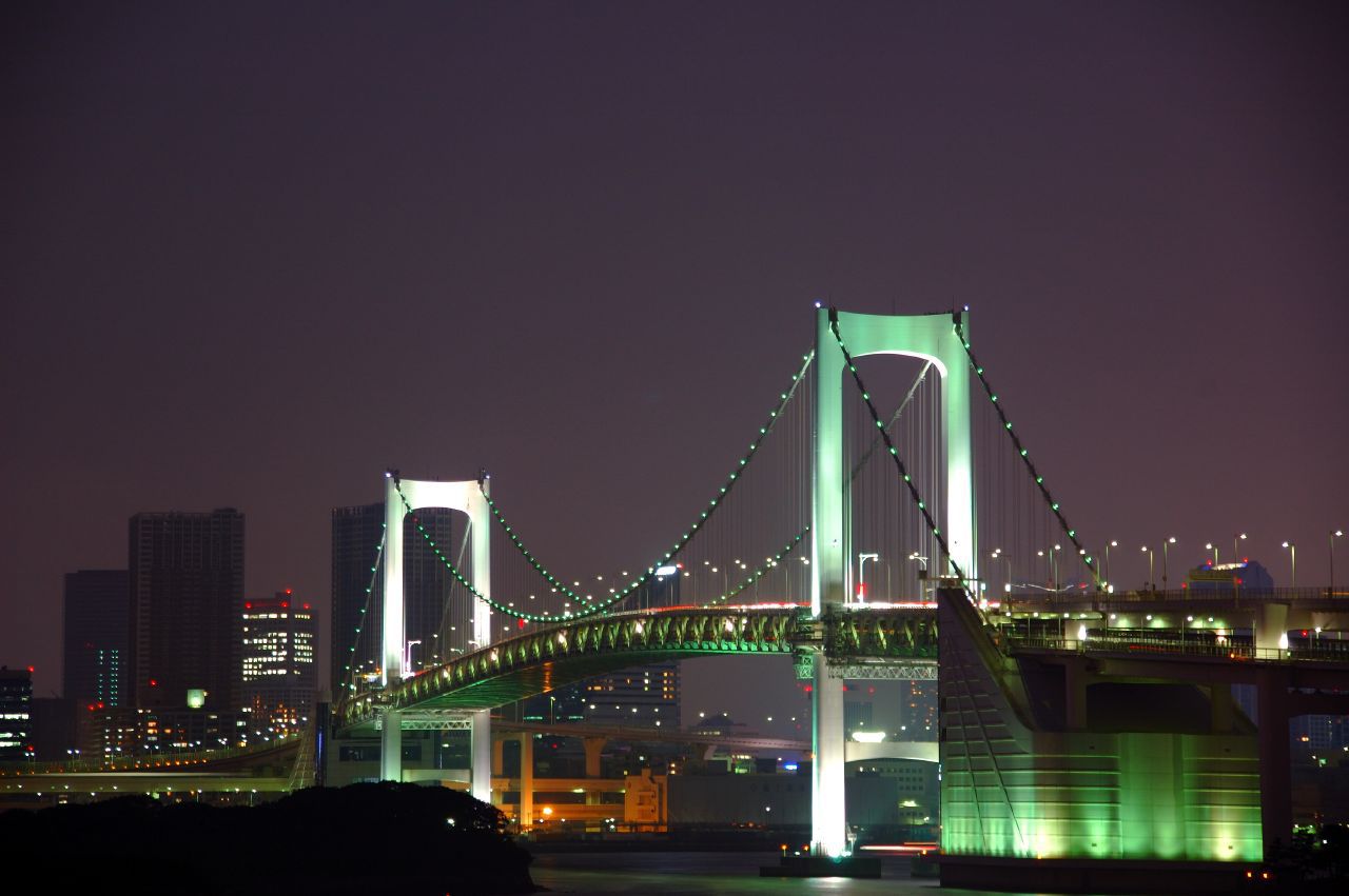 Tokyo's Rainbow Bridge illuminated in green lights at night, spanning across Tokyo Bay with the city skyline in the background.