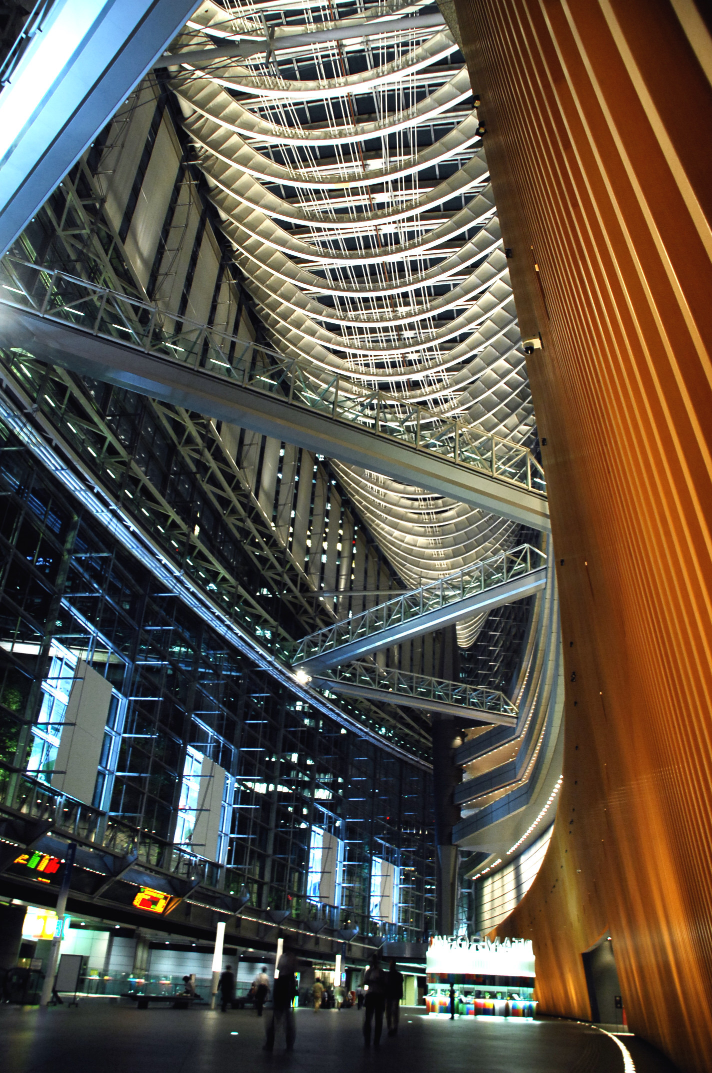 The stunning modern architecture of Tokyo International Forum, showcasing the dramatic curved glass and steel structure of the atrium with its wave-like ceiling design.
