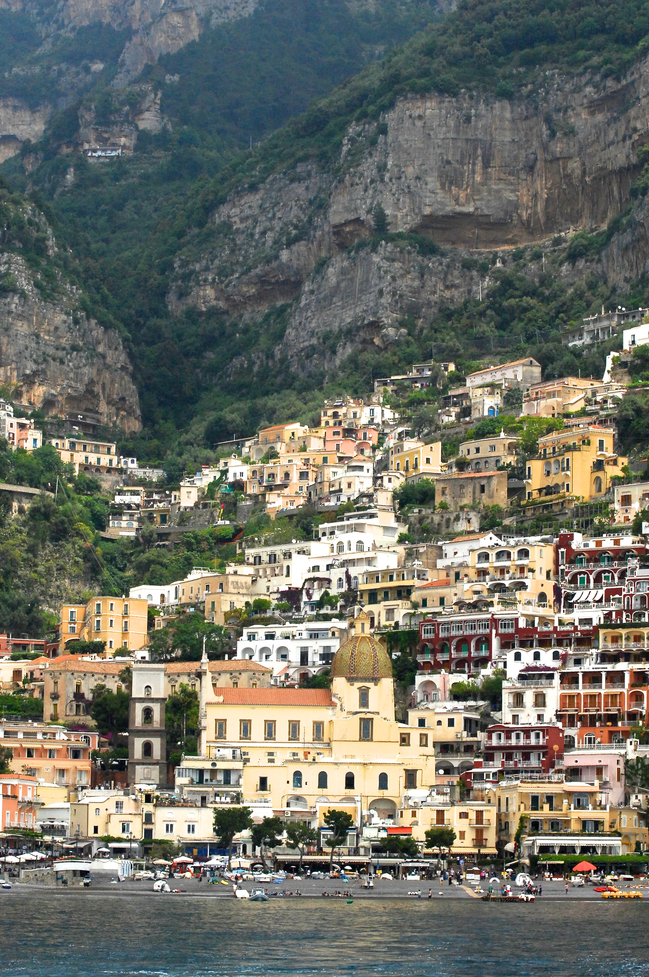 The picturesque town of Positano cascading down the dramatic cliffs of the Amalfi Coast. Colorful houses and buildings are stacked vertically along the mountainside, with the dome of Santa Maria Assunta church visible near the waterfront. A classic view of this stunning Italian coastal paradise.