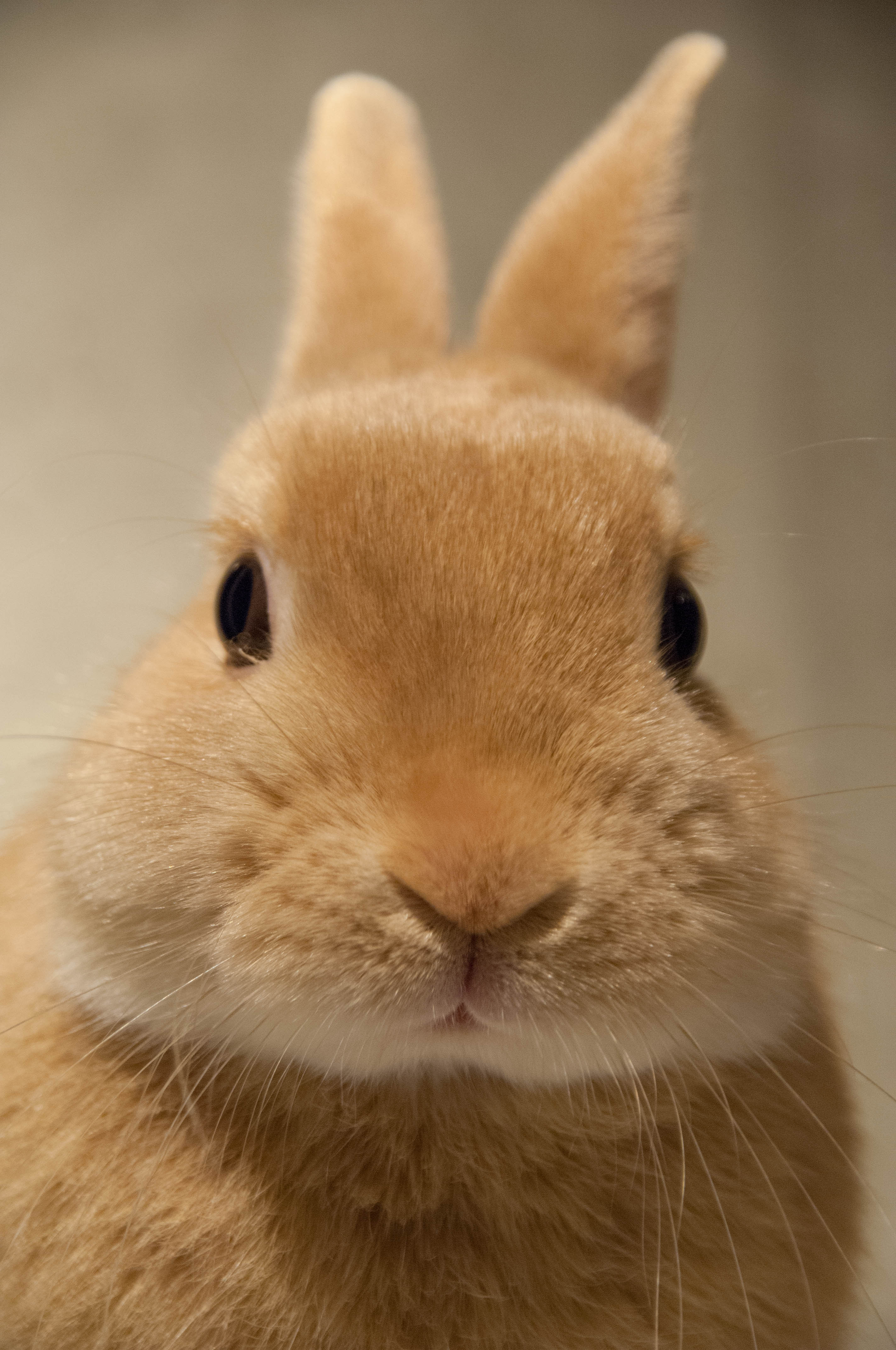 An adorable close-up portrait of a Netherland Dwarf rabbit with light brown fur, alert ears, and expressive dark eyes looking directly at the camera. The soft focus background emphasizes the rabbit's gentle features, delicate whiskers, and fluffy fur texture. This endearing portrait captures the curious and gentle nature of these beloved creatures.