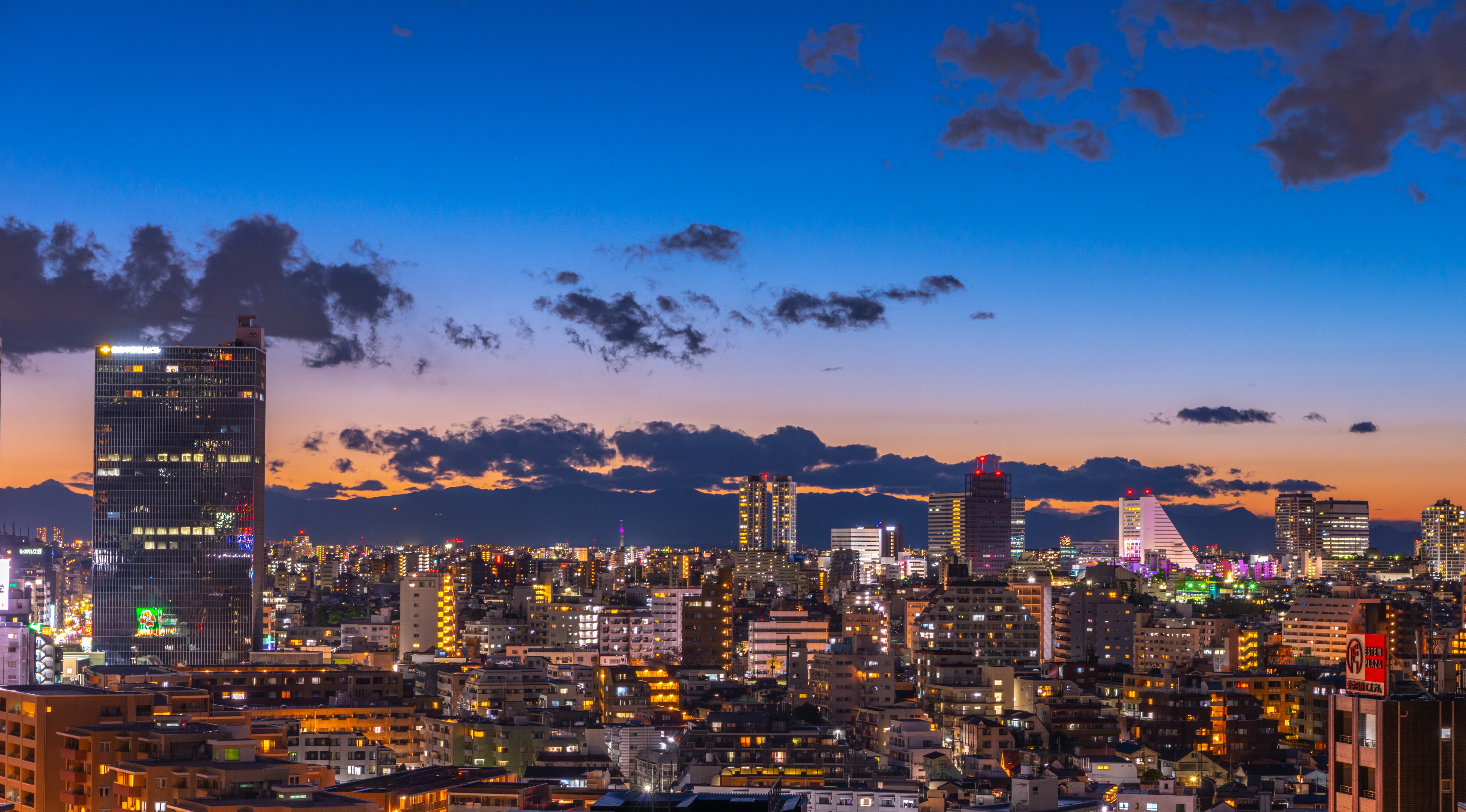 A beautifully illuminated street scene in Tokyo at night, capturing the vibrant urban atmosphere with light trails.