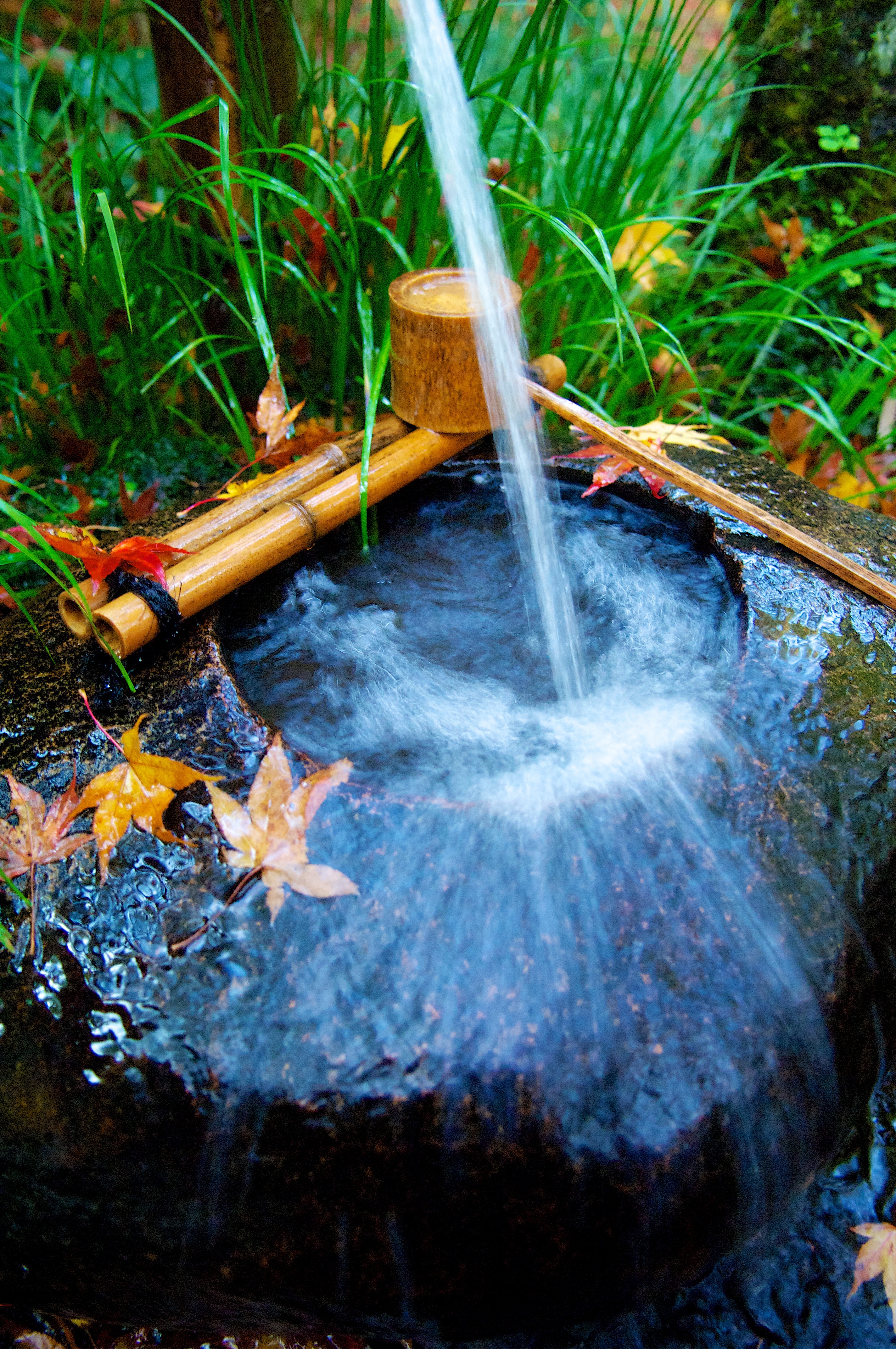 A traditional Japanese tsukubai water basin with a bamboo spout, surrounded by lush greenery and fallen autumn leaves.