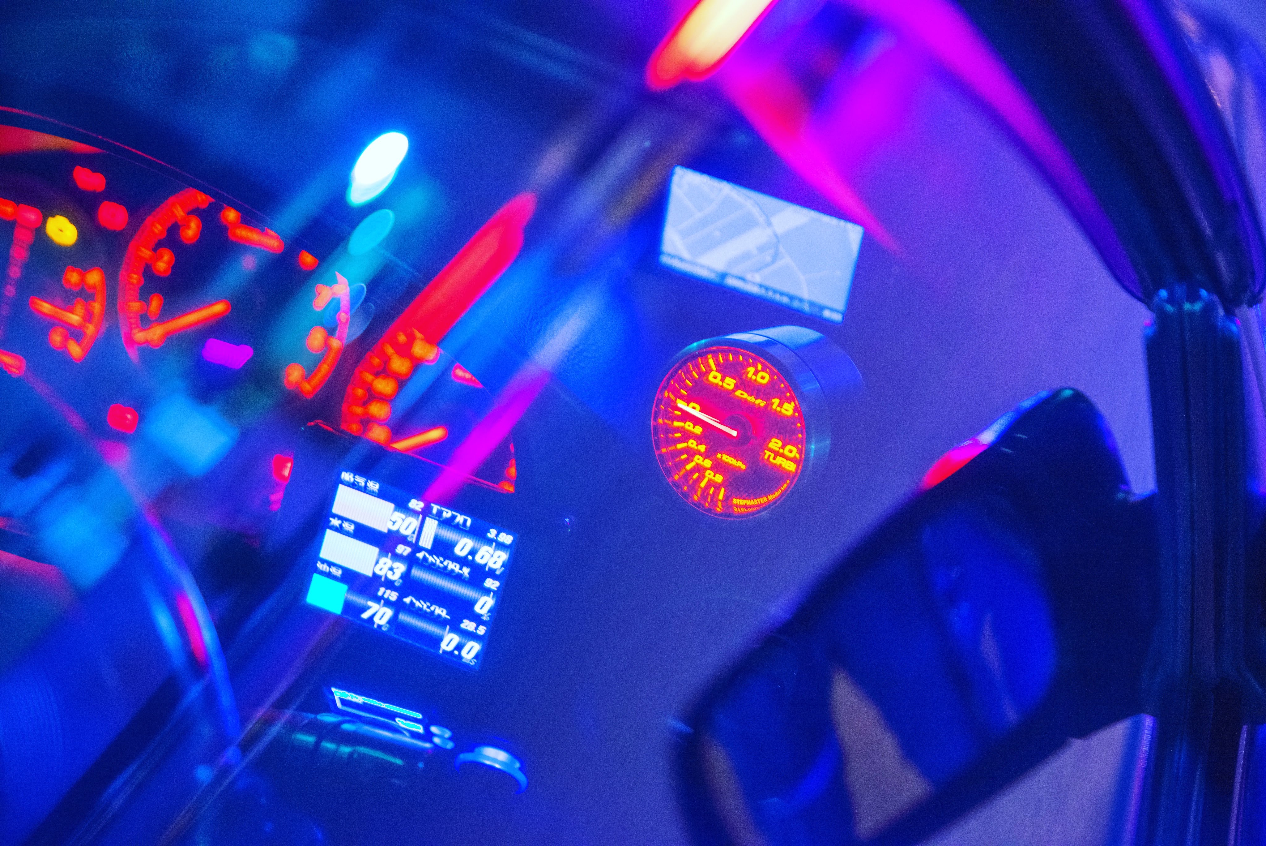 Inside a racing car illuminated by neon lights. Blue, purple, and red lights intersect, creating a futuristic atmosphere. Stickers and logos emerge from the light, capturing a cyberpunk moment where motorsports passion merges with contemporary aesthetics.