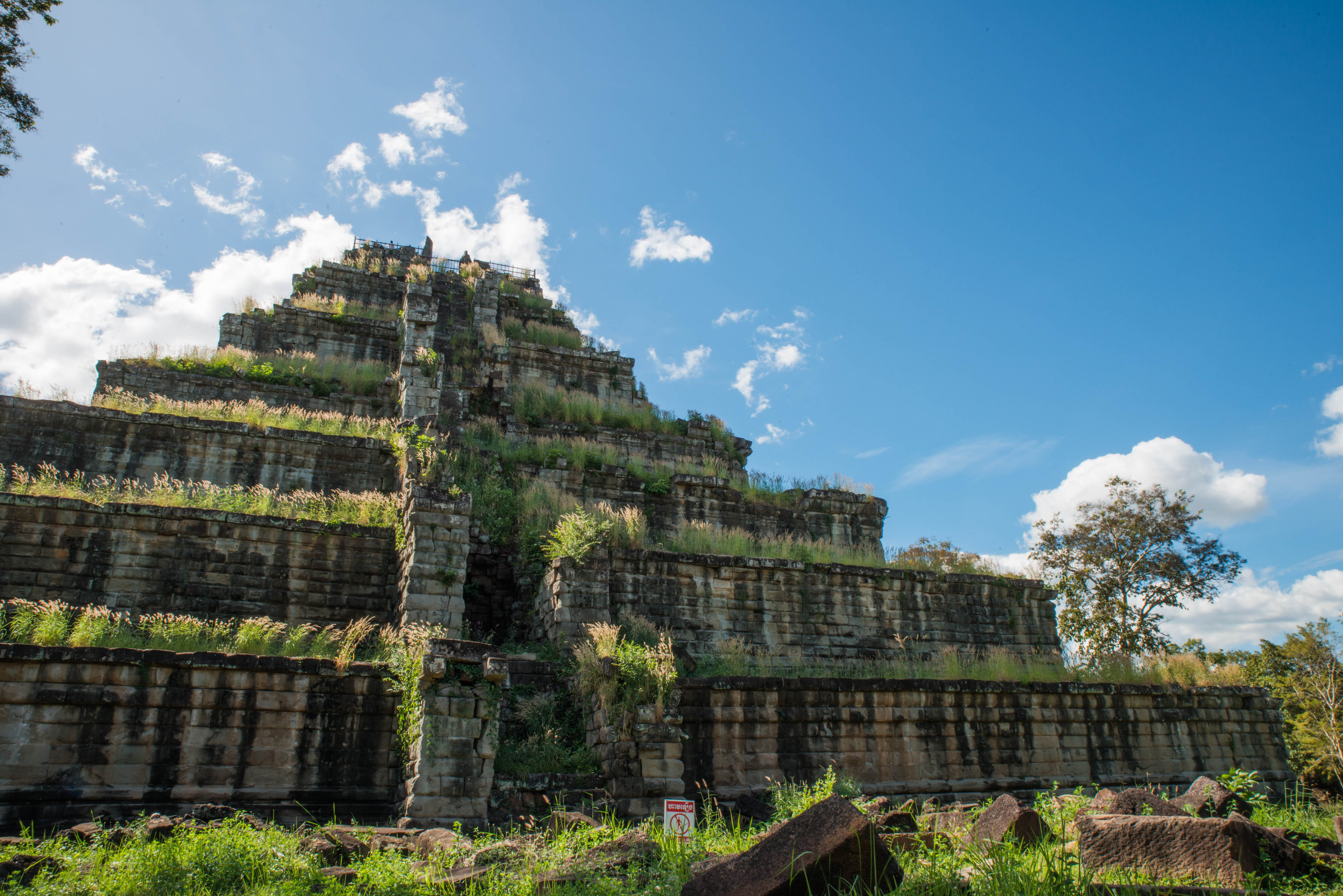 A timeless scene at the Beng Mealea ruins in Cambodia. Under blue skies, ancient temple stonework covered in green moss and vegetation stands integrated with nature. These ruins being swallowed by jungle tell a mysterious story of the Angkor civilization's glory and nature's power.