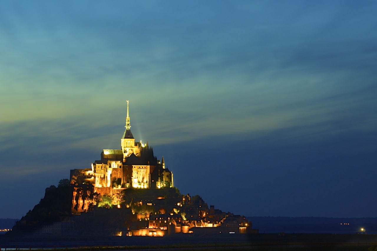 A stunning twilight view of Mont-Saint-Michel beautifully illuminated against the evening sky. The golden lights of the abbey and village glow warmly against the gradient blue and yellow sky, creating a magical atmosphere at this iconic French landmark.