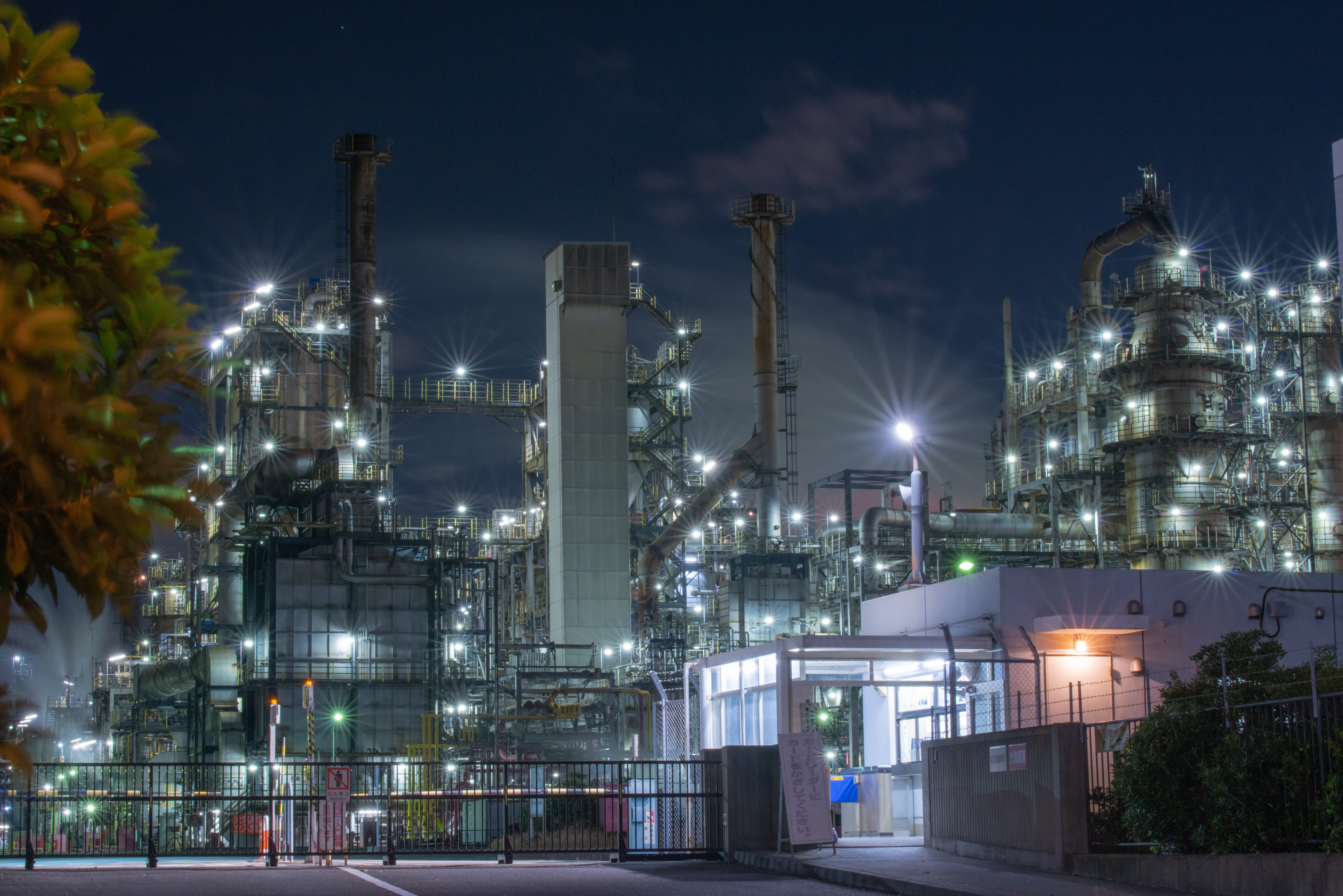 An industrial factory complex photographed at night through a security fence, with autumn foliage in the foreground. The facility's bright lights create an interesting contrast with the dark evening sky.