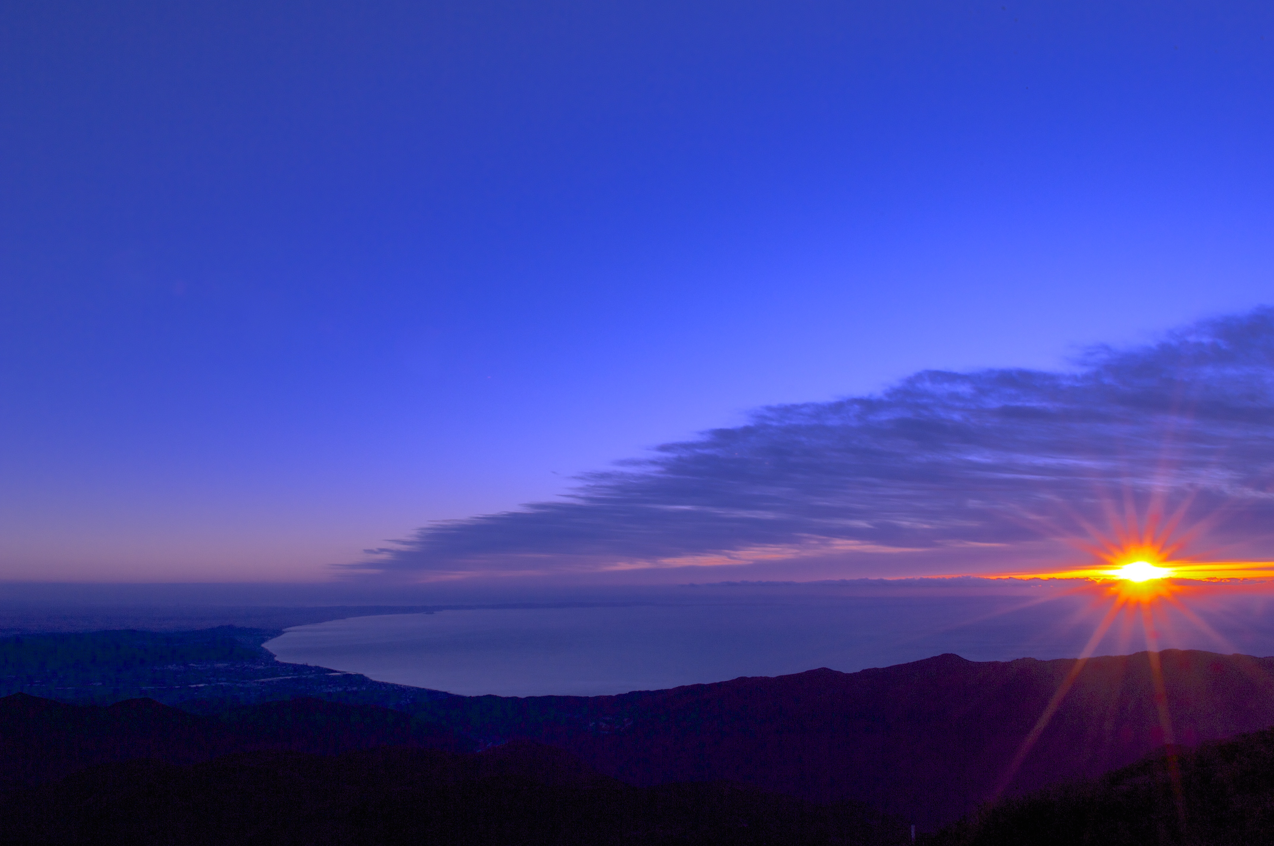 A breathtaking sunrise over Lake Ashinoko (Ashi) in Hakone, Japan, captured on New Year's Day. The sun rises dramatically over the mountain ridges with a vibrant gradient sky transitioning from deep blue to orange and pink. The first sunrise of the year (Hatsuhinode) is an important tradition in Japanese culture.